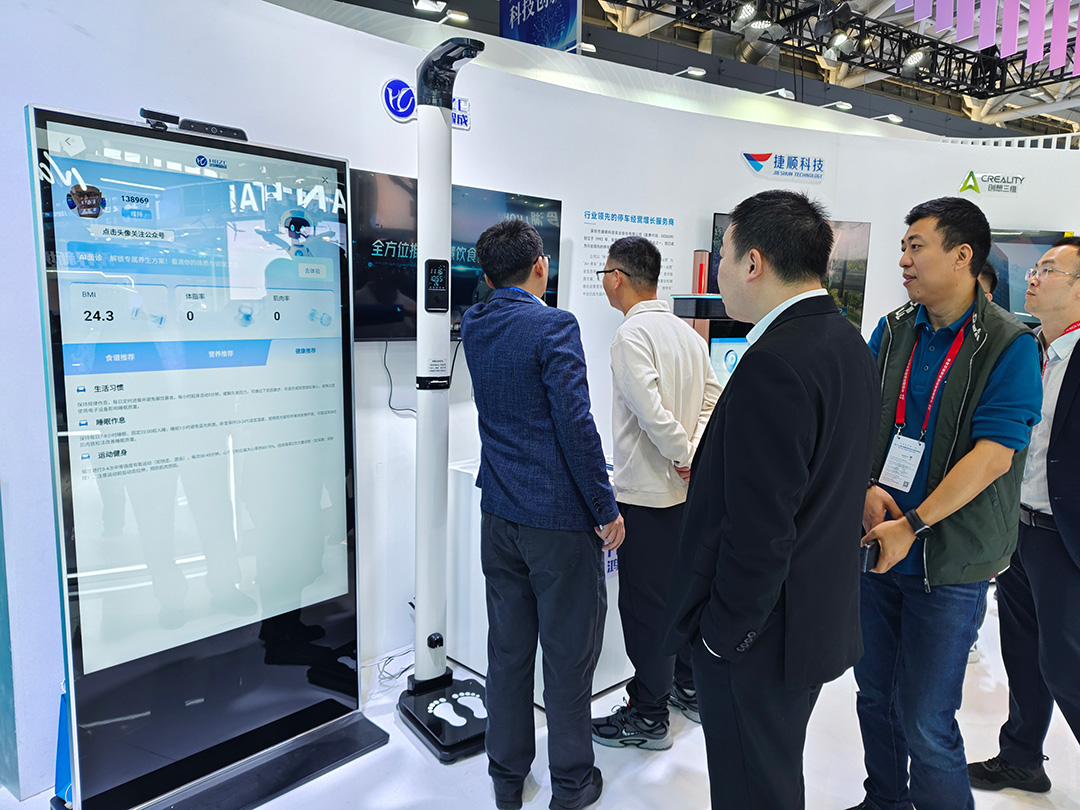 鸿博智成此次展出的"鸿博智膳"健康大模型及配套创新人工智能硬件产品,包括AI智慧测量仪、AI健康检测终端、AI智能取餐一体机等,展现了公司在智慧餐饮领域的全面布局。